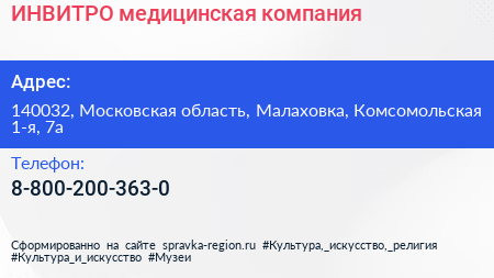 ИНВИТРО, медицинская компания по адресу 140032, Московская область, Малаховка, Комсомольская 1-я, 7а в дальнейшем Организация, размещена в следующих категориях: