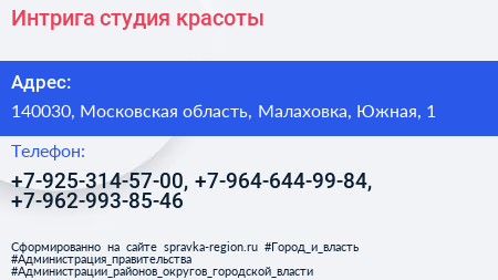 Интрига, студия красоты по адресу 140030, Московская область, Малаховка, Южная, 1 в дальнейшем Организация, размещена в следующих категориях: