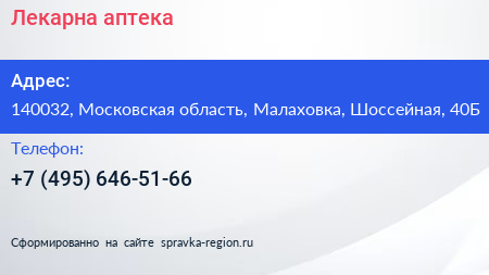 Лекарна, аптека по адресу 140032, Московская область, Малаховка, Шоссейная, 40Б в дальнейшем Организация, размещена в следующих категориях: