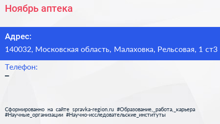Ноябрь, аптека по адресу 140032, Московская область, Малаховка, Рельсовая, 1 ст3 в дальнейшем Организация, размещена в следующих категориях: