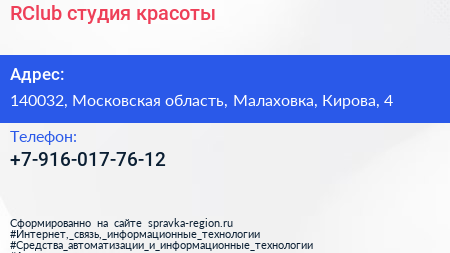 RClub, студия красоты по адресу 140032, Московская область, Малаховка, Кирова, 4 в дальнейшем Организация, размещена в следующих категориях: