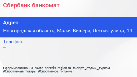 Сбербанк, банкомат по адресу Новгородская область, Малая Вишера, Лесная улица, 14 в дальнейшем Организация, размещена в следующих категориях: