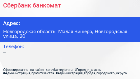Сбербанк, банкомат по адресу Новгородская область, Малая Вишера, Новгородская улица, 20 в дальнейшем Организация, размещена в следующих категориях:
