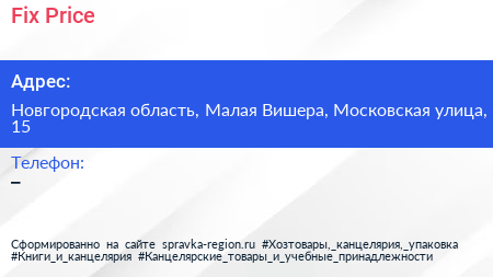 Fix Price по адресу Новгородская область, Малая Вишера, Московская улица, 15 в дальнейшем Организация, размещена в следующих категориях: