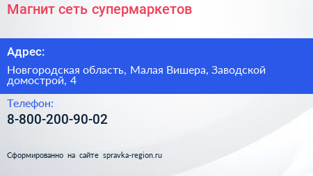 Магнит, сеть супермаркетов по адресу Новгородская область, Малая Вишера, Заводской домострой, 4 в дальнейшем Организация, размещена в следующих категориях: