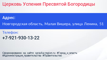 Церковь Успения Пресвятой Богородицы по адресу Новгородская область, Малая Вишера, улица Ленина, 51 в дальнейшем Организация, размещена в следующих категориях: