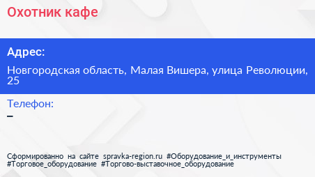 Охотник, кафе по адресу Новгородская область, Малая Вишера, улица Революции, 25 в дальнейшем Организация, размещена в следующих категориях:
