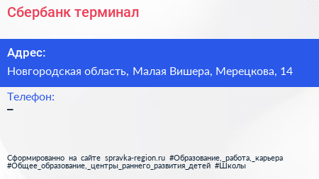 Сбербанк, терминал по адресу Новгородская область, Малая Вишера, Мерецкова, 14 в дальнейшем Организация, размещена в следующих категориях: