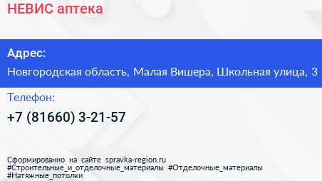 НЕВИС, аптека по адресу Новгородская область, Малая Вишера, Школьная улица, 3 в дальнейшем Организация, размещена в следующих категориях: