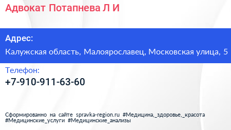 Адвокат Потапнева Л.И. по адресу Калужская область, Малоярославец, Московская улица, 5 в дальнейшем Организация, размещена в следующих категориях: