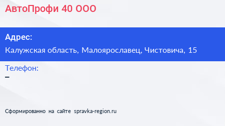 АвтоПрофи-40, ООО по адресу Калужская область, Малоярославец, Чистовича, 15 в дальнейшем Организация, размещена в следующих категориях: