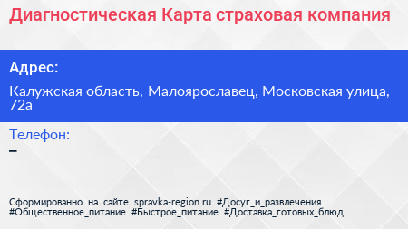 Диагностическая Карта, страховая компания по адресу Калужская область, Малоярославец, Московская улица, 72а в дальнейшем Организация, размещена в следующих категориях: