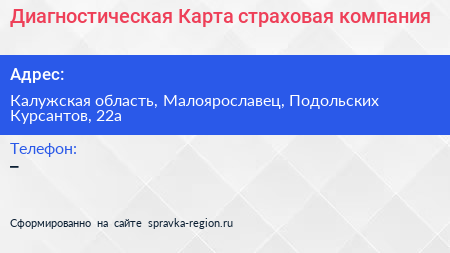 Диагностическая Карта, страховая компания по адресу Калужская область, Малоярославец, Подольских Курсантов, 22а в дальнейшем Организация, размещена в следующих категориях: