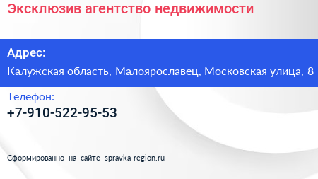 Эксклюзив, агентство недвижимости по адресу Калужская область, Малоярославец, Московская улица, 8 в дальнейшем Организация, размещена в следующих категориях: