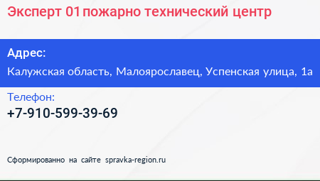 Эксперт 01, пожарно-технический центр по адресу Калужская область, Малоярославец, Успенская улица, 1а в дальнейшем Организация, размещена в следующих категориях: