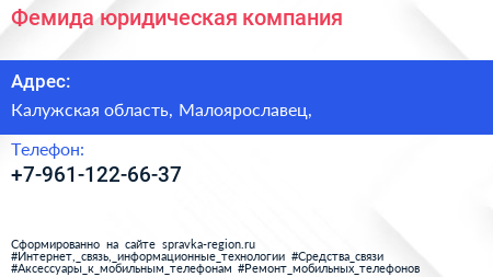 Фемида, юридическая компания по адресу Калужская область, Малоярославец, в дальнейшем Организация, размещена в следующих категориях: