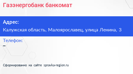 Газэнергобанк, банкомат по адресу Калужская область, Малоярославец, улица Ленина, 3 в дальнейшем Организация, размещена в следующих категориях: