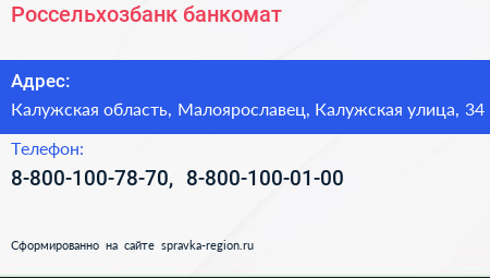 Россельхозбанк, банкомат по адресу Калужская область, Малоярославец, Калужская улица, 34 в дальнейшем Организация, размещена в следующих категориях: