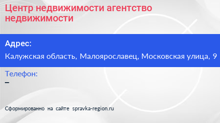 Центр недвижимости, агентство недвижимости по адресу Калужская область, Малоярославец, Московская улица, 9 в дальнейшем Организация, размещена в следующих категориях: