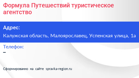 Формула Путешествий, туристическое агентство по адресу Калужская область, Малоярославец, Успенская улица, 1а в дальнейшем Организация, размещена в следующих категориях: