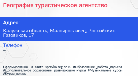 География, туристическое агентство по адресу Калужская область, Малоярославец, Российских Газовиков, 17 в дальнейшем Организация, размещена в следующих категориях: