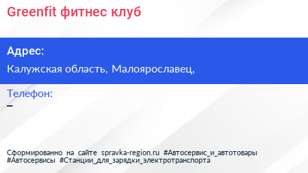 Greenfit, фитнес-клуб по адресу Калужская область, Малоярославец, в дальнейшем Организация, размещена в следующих категориях: