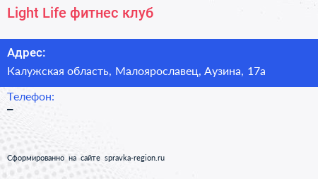 Light Life, фитнес-клуб по адресу Калужская область, Малоярославец, Аузина, 17а в дальнейшем Организация, размещена в следующих категориях: