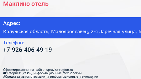 Маклино, отель по адресу Калужская область, Малоярославец, 2-я Заречная улица, 6 в дальнейшем Организация, размещена в следующих категориях: