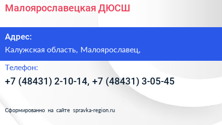 Малоярославецкая ДЮСШ по адресу Калужская область, Малоярославец, в дальнейшем Организация, размещена в следующих категориях:
