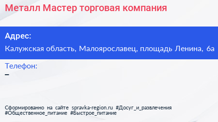 Металл-Мастер, торговая компания по адресу Калужская область, Малоярославец, площадь Ленина, 6а в дальнейшем Организация, размещена в следующих категориях:
