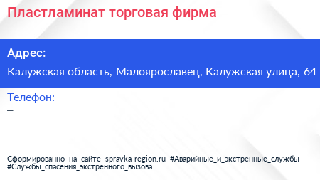 Пластламинат, торговая фирма по адресу Калужская область, Малоярославец, Калужская улица, 64 в дальнейшем Организация, размещена в следующих категориях: