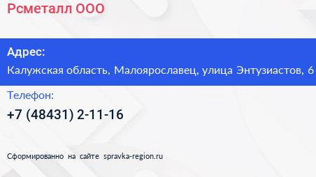 Рсметалл, ООО по адресу Калужская область, Малоярославец, улица Энтузиастов, 6 в дальнейшем Организация, размещена в следующих категориях: