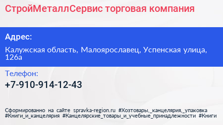 СтройМеталлСервис, торговая компания по адресу Калужская область, Малоярославец, Успенская улица, 126а в дальнейшем Организация, размещена в следующих категориях: