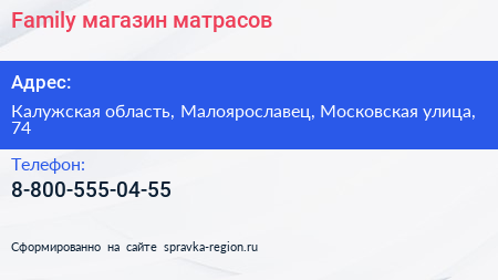 Family, магазин матрасов по адресу Калужская область, Малоярославец, Московская улица, 74 в дальнейшем Организация, размещена в следующих категориях: