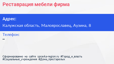 Реставрация мебели, фирма по адресу Калужская область, Малоярославец, Аузина, 8 в дальнейшем Организация, размещена в следующих категориях: