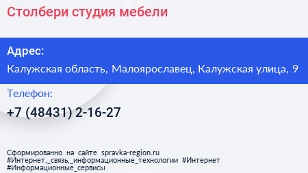 Столбери, студия мебели по адресу Калужская область, Малоярославец, Калужская улица, 9 в дальнейшем Организация, размещена в следующих категориях: