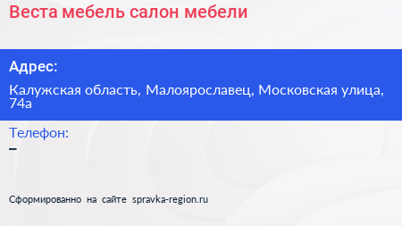 Веста-мебель, салон мебели по адресу Калужская область, Малоярославец, Московская улица, 74а в дальнейшем Организация, размещена в следующих категориях: