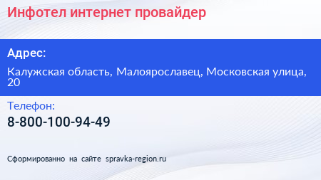 Инфотел, интернет-провайдер по адресу Калужская область, Малоярославец, Московская улица, 20 в дальнейшем Организация, размещена в следующих категориях: