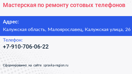 Мастерская по ремонту сотовых телефонов по адресу Калужская область, Малоярославец, Калужская улица, 26 в дальнейшем Организация, размещена в следующих категориях: