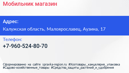 Мобильник, магазин по адресу Калужская область, Малоярославец, Аузина, 17 в дальнейшем Организация, размещена в следующих категориях:
