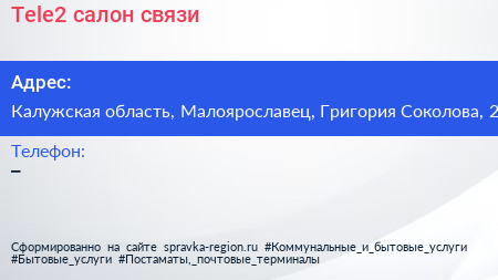 Tele2, салон связи по адресу Калужская область, Малоярославец, Григория Соколова, 2 в дальнейшем Организация, размещена в следующих категориях:
