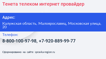 Тенета телеком, интернет-провайдер по адресу Калужская область, Малоярославец, Московская улица, 20 в дальнейшем Организация, размещена в следующих категориях: