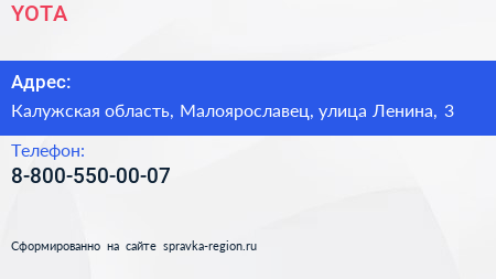 YOTA по адресу Калужская область, Малоярославец, улица Ленина, 3 в дальнейшем Организация, размещена в следующих категориях:
