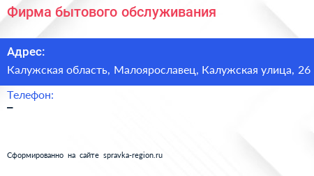 Фирма бытового обслуживания по адресу Калужская область, Малоярославец, Калужская улица, 26 в дальнейшем Организация, размещена в следующих категориях: