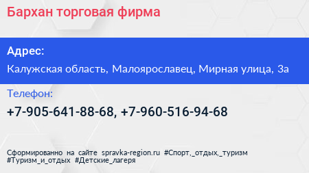 Бархан, торговая фирма по адресу Калужская область, Малоярославец, Мирная улица, 3а в дальнейшем Организация, размещена в следующих категориях: