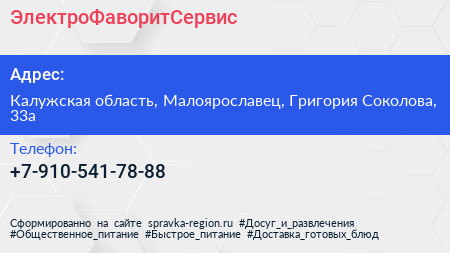 ЭлектроФаворитСервис по адресу Калужская область, Малоярославец, Григория Соколова, 33а в дальнейшем Организация, размещена в следующих категориях: