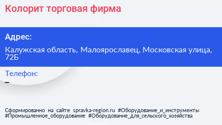 Колорит, торговая фирма по адресу Калужская область, Малоярославец, Московская улица, 72Б в дальнейшем Организация, размещена в следующих категориях: