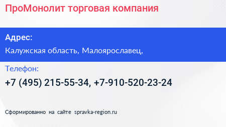 ПроМонолит, торговая компания по адресу Калужская область, Малоярославец, в дальнейшем Организация, размещена в следующих категориях: