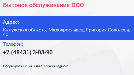 Бытовое обслуживание, ООО по адресу Калужская область, Малоярославец, Григория Соколова, 40 в дальнейшем Организация, размещена в следующих категориях: