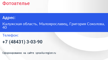 Фотоателье по адресу Калужская область, Малоярославец, Григория Соколова, 40 в дальнейшем Организация, размещена в следующих категориях: